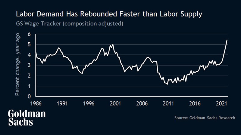 As pandemic restrictions were lifted, labor demand recovered much more quickly than the labor force itself. As a result, wages jumped 5.5% during the past year, according to Goldman Sachs’ Wage Tracker. If this pace continues, the Federal Reserve would have a difficult time achieving its longer-run inflation goal of 2%. Labor participation is expected to pick up in the U.S., adding as many as 1.5 million workers over the coming year, but economists at Goldman Sachs predict that will leave a sizable jobs-workers gap of around 1 million.