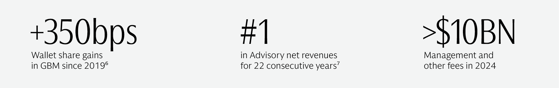 2Based on cumulative publicly disclosed net revenues (2020–2024) for Investment banking fees (consists of Advisory, Equity underwriting and Debt underwriting), FICC and Equities. Peers include MS, JPM, BAC, C, BARC, DB, UBS, CS (through FY22).