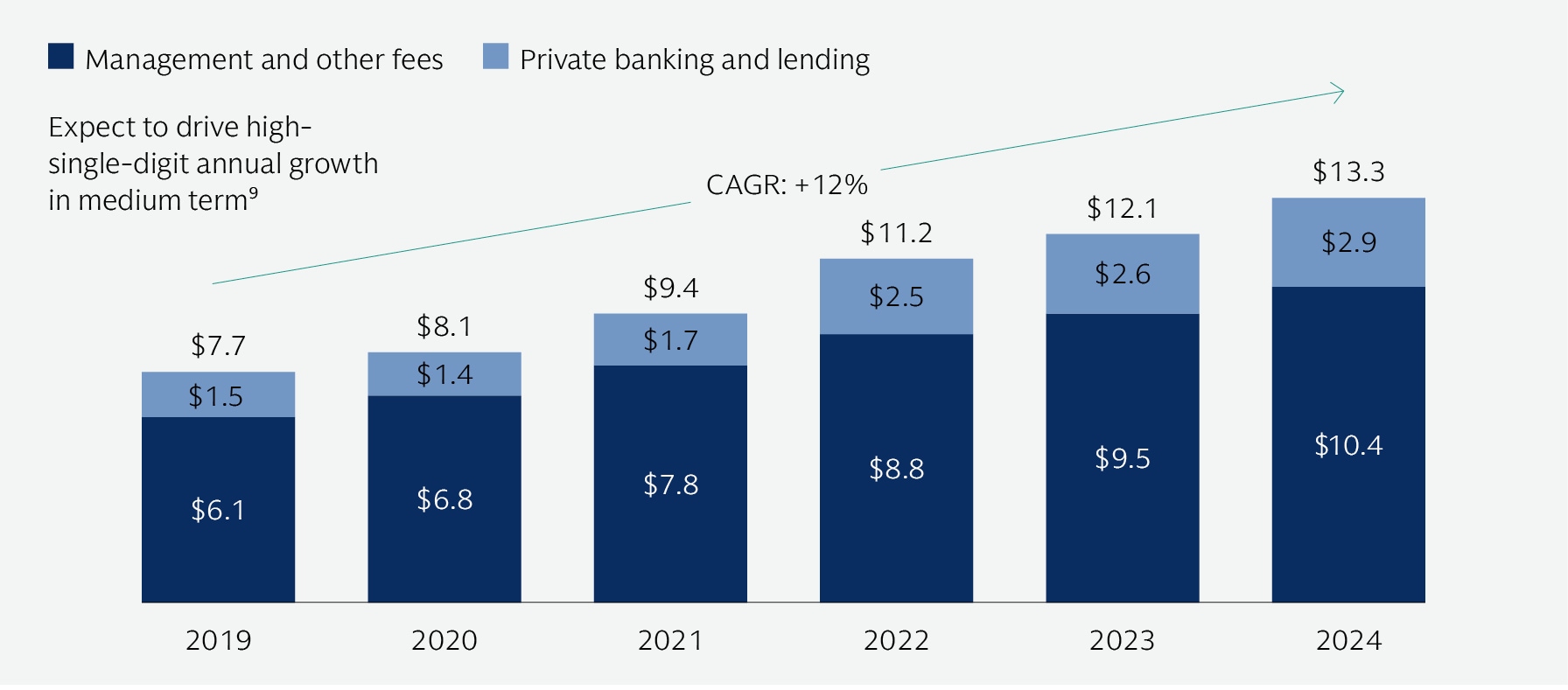 We also bolstered our more durable revenue streams. In 2024, we surpassed our target of annual Management and other fees of more than $10 billion. Management and other fees and Private banking and lending net revenues together have grown at a compounded annual growth rate of 12 percent since 2019, and we continue to expect to drive high-single-digit annual growth in the coming years.