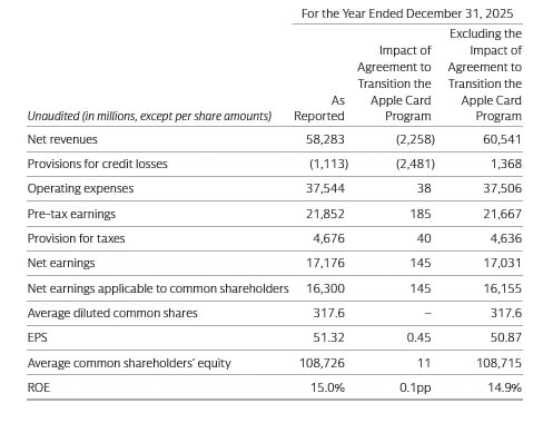 4. In the fourth quarter of 2025, the firm entered into an agreement to transition the Apple Card program to another issuer. Results reflect the impact of transferring the credit card portfolio to held for sale status and related impacts of contract termination obligations and other expenses. Management believes that presenting the firm’s results excluding these impacts is meaningful as excluding these impacts increases the comparability of period-to-period results. The firm’s results excluding these impacts are non-GAAP measures and may not be comparable to similar non-GAAP measures used by other companies. The table below presents the calculation of the firm’s results excluding the impact of entering into an agreement to transition the Apple Card program: