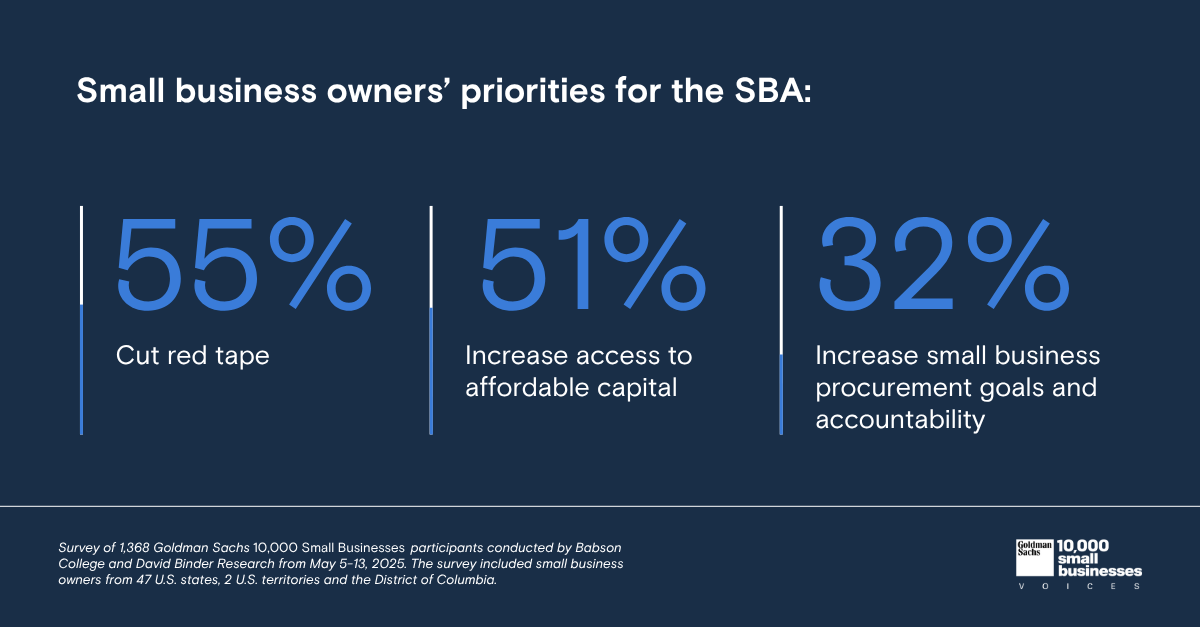 80% of small business owners say that navigating complex regulations takes time away from managing and growing their businesses. They want the Small Business Administration (SBA) to focus on cutting red tape for small businesses (55%), increasing access to affordable capital (51%), and increasing small business procurement goals and accountability (32%).