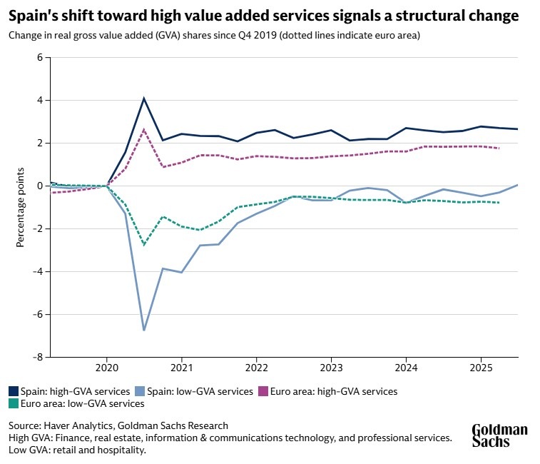 “The shift toward high value-added services is the least appreciated structural change of the Spanish economy in our conversations with investors,” Filippo Taddei, senior economist focusing on southern Europe and European policy within the European Economics team, writes in the team’s report. The share of high value-added services in Spain’s GDP is now 3 percentage points higher than it was pre-pandemic and has increased by 1 percentage point more than in the rest of the euro area.