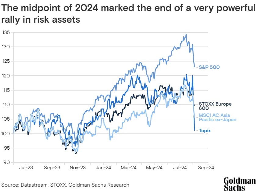 From their peak in July, the US’s S&P 500 Index is down 4%, the STOXX Europe 600 declined 5%, and China’s CSI 300 dropped 6% (as of Aug. 7). In some markets, recent declines follow a period of strong returns; the S&P 500 is up 10% year-to-date.