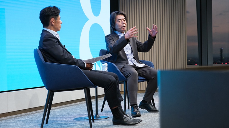 展覧会の開催に先立ち、著名なアーティストであり、現在東京藝術大学の学長を務める日比野克彦氏と居松社長との対談が行われました。