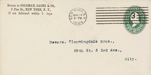 Twenty-five years after Marcus Goldman had arrived in New York, his firm had five partners: himself, Samuel Sachs, Ludwig Dreyfuss, Henry Goldman and Harry Sachs (Samuel’s brother). Goldman Sachs’ offices were at 9 Pine Street and 10 Wall Street, mere steps away from the Victorian New York Stock Exchange building on Broad Street. A new neoclassical building for the Stock Exchange would be completed in 1903.