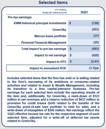 Selected items related to the execution of strategic goals outlined at Investor Day impacted the firm’s results this quarter, which in aggregate, reduced net earnings by $828 million, EPS by $2.41, and ROE by 3.1 percentage points. These items include: