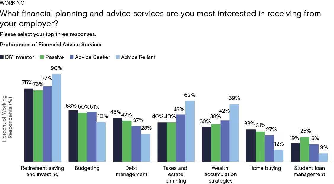For employers looking to enhance their current offerings, working respondents noted financial planning and advice, and employer contributions are the most valued services, surpassing all other focus areas. This preference reflects the significant challenges employees encounter in managing their savings. The top additional benefits employees want if their employer could contribute an additional $1,000 toward their available offerings include higher retirement contributions, emergency savings contributions and guaranteed retirement income.
