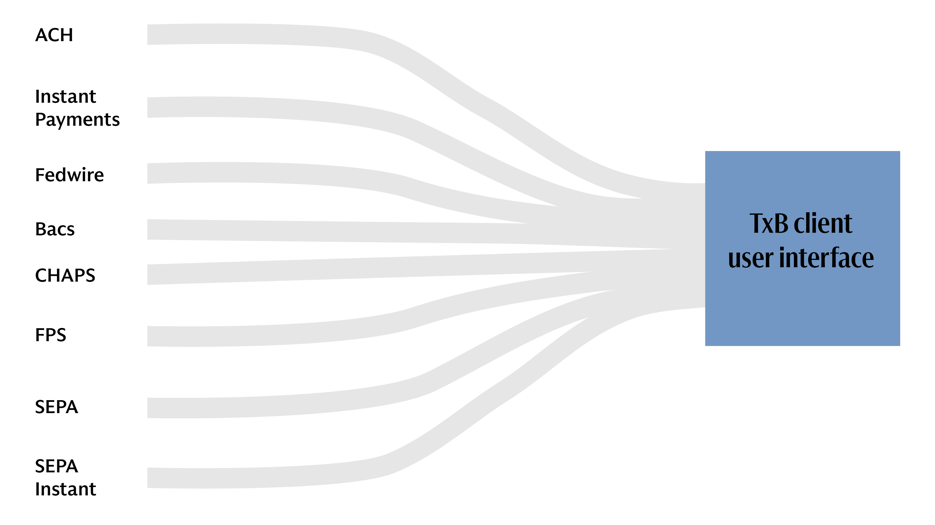 An integrated approach simplifies managing multiple payment channels. SWIFT, local clearing, and other payment rails connect through one interface, so no additional message formats or separate onboardings are required, significantly lowering migration risk when utilizing a new payment rail.