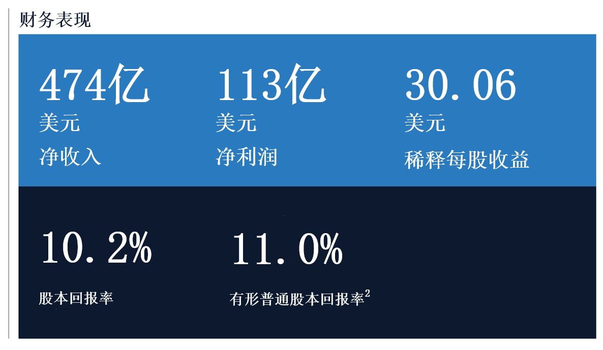 尽管困难重重,我们仍在2022年为股东实现了回报。净收入为474亿美元,净利润为113亿美元,稀释每股收益为30.06美元。平均普通股本回报率为10.2%,有形普通股本回报率2 为11.0%。公司每股账面价值增长了6.7%,并持续取得重大战略进展。因此,尽管在股票发行触及近20年来低位的宏观环境下,我们的业绩仍优于三年以前。