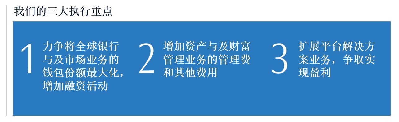 此次,我们采用新的架构进行业绩披露,并公布三大执行重点:1)将全球银行及市场业务的钱包份额最大化,增加融资活动;2)增加资产及财富管理业务的管理费和其他费用;以及3)扩展平台解决方案业务,争取实现盈利。我们相信我们有能力执行战略,并利用优势,实现所有业务板块的执行重点。