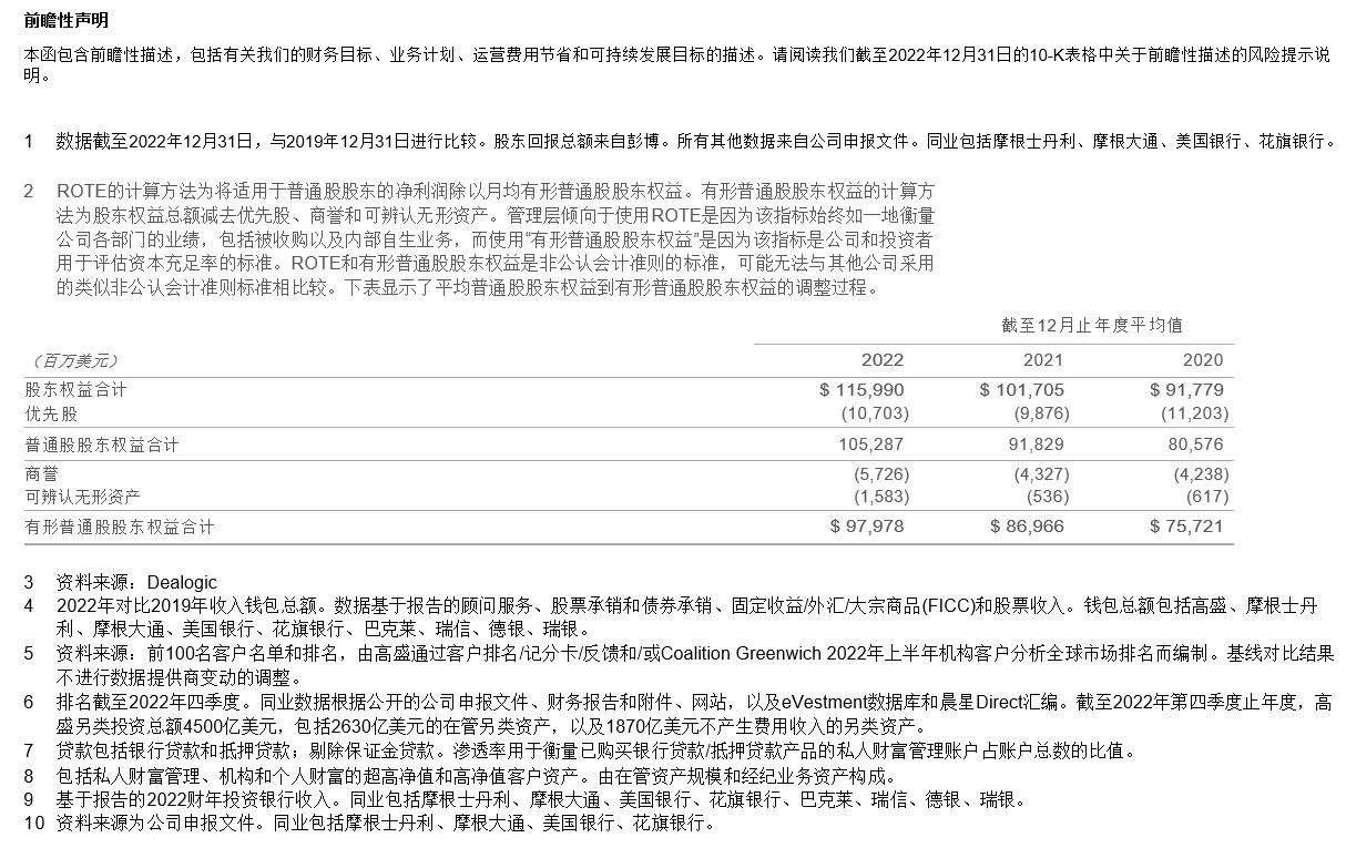 尽管如此,我们持续专注于股东利益,对此,我为高盛近年来所取得的成就感到自豪。自2020年首次投资者日以来,高盛的股东总回报率为60%,大幅超越同业平均水平。(注释1)高盛的每股账面价值增长了近40%,约为最接近同业竞争对手的两倍。1我们的每股收益增长了40%以上,并已向普通股东提供了近180亿美元的资本回报。我们过去三年的平均回报率符合公司目前14%–16%的平均普通股本回报率(ROE)目标及15%-17%的有形普通股本回报率(ROTE)目标。(注释2)