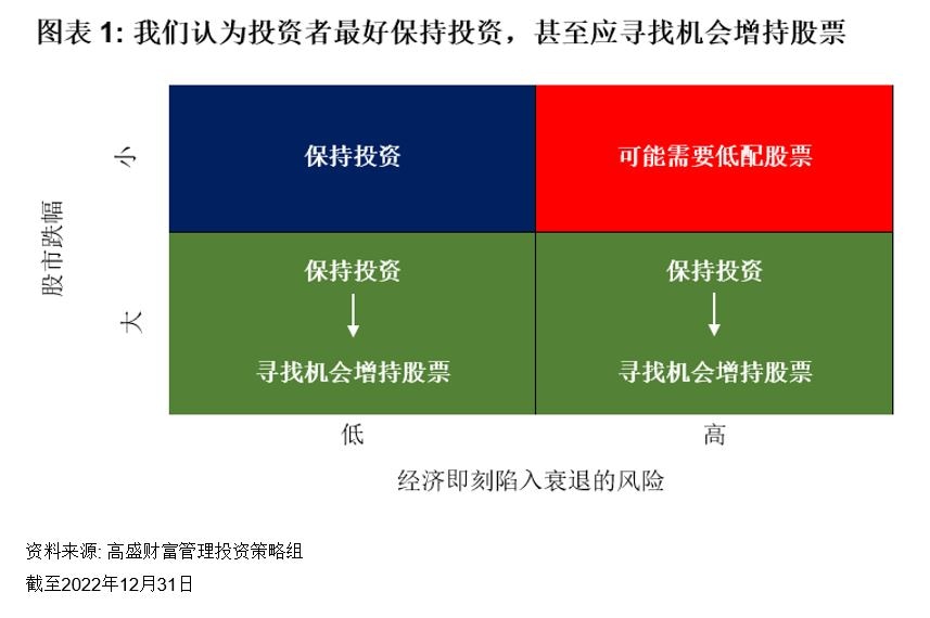 尽管2023年的投资环境仍充满高度的不确定性,高盛财富管理投资策略组在最近发布的2023年投资展望报告中重申其两大投资主题: 美元资产优先和保持投资。目前,高盛投资策略组认为经济衰退并非近在眼前,且当前股市的下跌也已部分反映了经济衰退的风险,因此建议保持投资,避免过多非必要的战略资产配置调整。