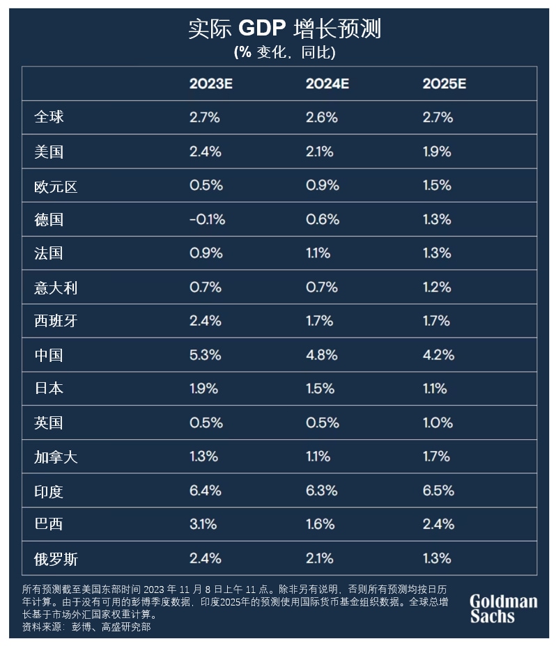 随着通货膨胀温和冷却、就业市场强劲复苏,以及加息对GDP增长所带来的影响达到峰值,高盛研究部的经济学家们预测明年将有强劲的收入增长,制造业或进一步复苏。与此同时,若中央银行担心经济增长放缓,将有可能更进一步降低利率。基于上述背景,以首席经济学家哈哲思 (Jan Hatzius) 带领的高盛研究部宏观经济团队预计2024年全球GDP增速为2.6%,高于彭博社统整的共识预测增速2.1%。