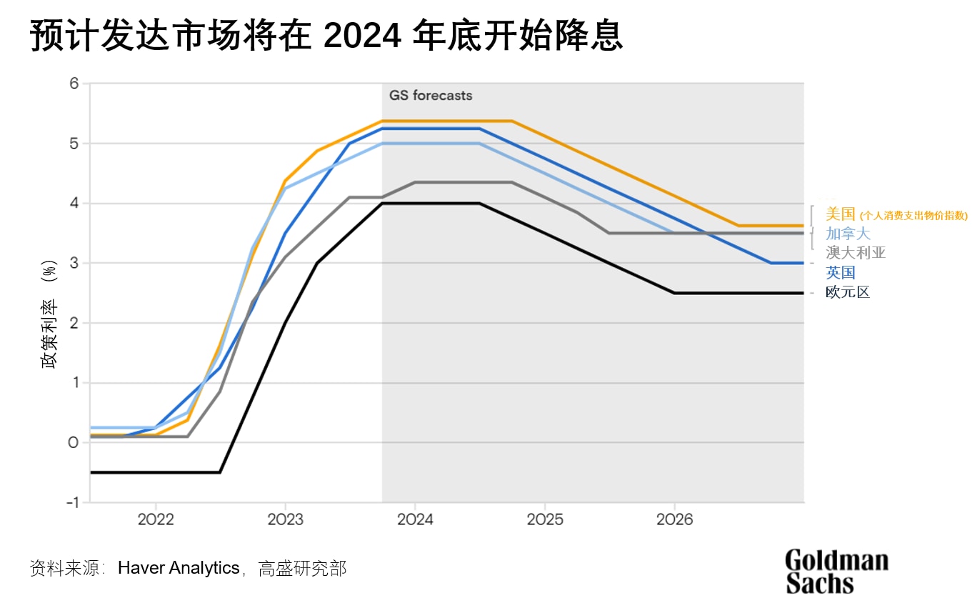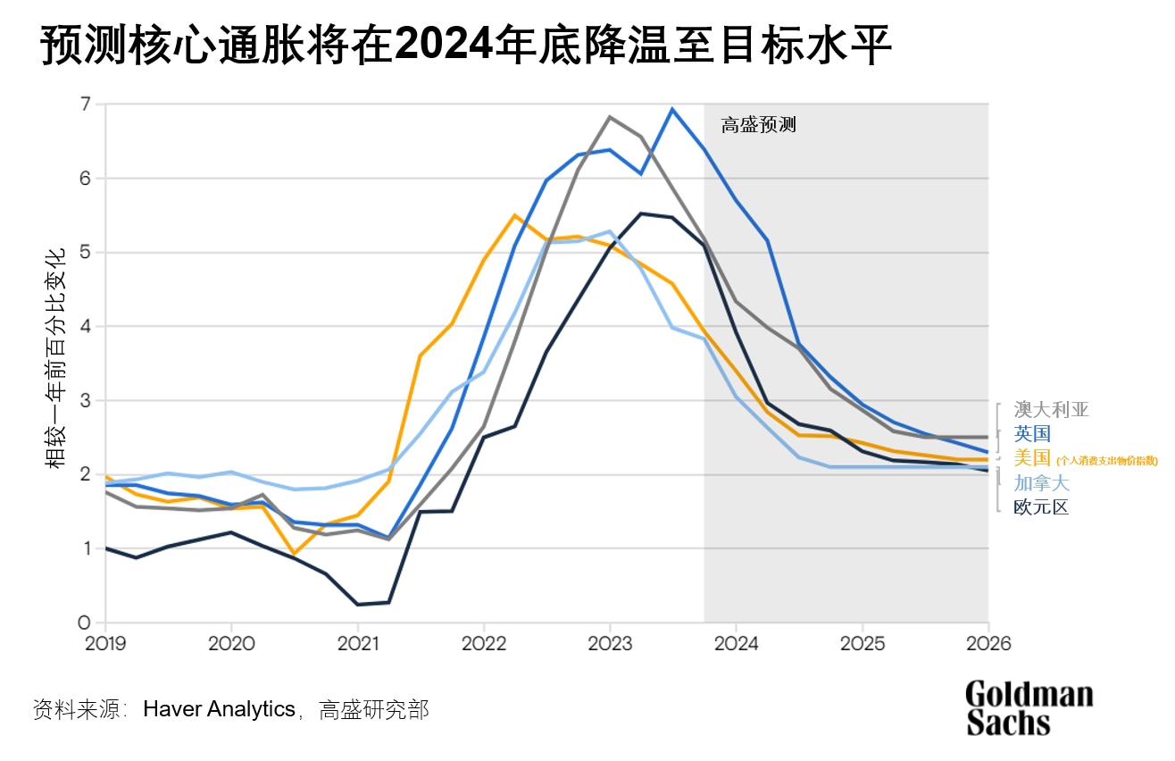 高盛研究部的经济学家预测,2024年G10(不包括日本)的核心通胀率将从现在的3%下降到2-2.5%。“这与大多数发达市场央行到2024年底的通胀目标基本一致,”哈哲思写道。