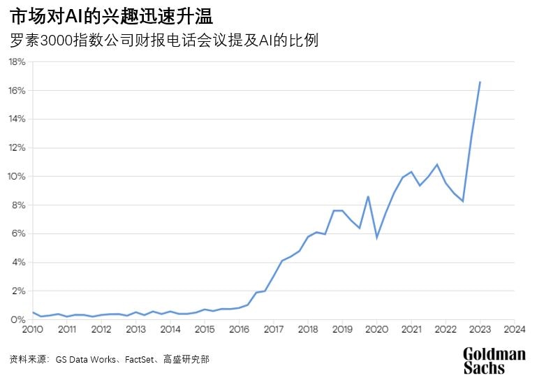 虽然AI提高生产力尚需时日,但市场对AI的兴趣已经迅速升温,罗素3000指数公司中超过16%的公司在财报电话会议中提及AI技术,而2016年这一数字尚不足1%。其中大约一半增长出现在2022年第四季度发布ChatGPT之后。高盛经济学家此前的研究表明,此类信号往往预示着公司层面的资本支出将增加。
