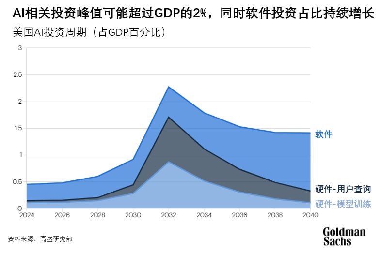 AI投资预计将集中在四个关键业务领域:训练开发AI模型的公司、提供AI应用基础设施 (如数据中心) 的公司、开发运行AI应用软件的公司,以及付费使用这些软件和云基础设施服务的企业终端用户。高盛经济学家预计,AI投资将主要来自训练AI模型和运行AI查询的硬件投资,以及AI软件方面的支出增加。