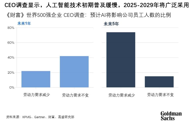2021年美国商业调查显示,仅有4%的美国公司披露在业务流程中采用了AI。CEO调查也显示,不到四分之一的CEO预计生成式AI将在未来1到3年内影响其公司或降低其劳动力需求。尽管如此,绝大多数CEO预计将在3至10年内采用AI。如果这些时间表预测准确,那么AI技术的采用或将从2025-2030年之间的某个时间点开始对美国经济产生较为明显的影响。