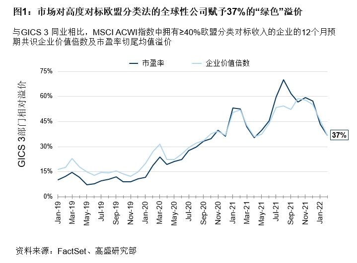 2. 我们发现,与欧盟分类法 (EU Taxonomy) 高度对标的亚太地区公司享有“绿色”溢价。随着更多的亚太地区分类法出现,这一溢价可能会扩展到其他行业。使用欧盟分类法作为未来亚太地区标准的代理指标,我们发现对于高度对标的全球性公司而言,其市盈率和企业价值倍数的行业相对溢价为 37%,而高度对标的亚太地区股票(主要是中国风电和光伏企业)溢价分别为55%和64%。