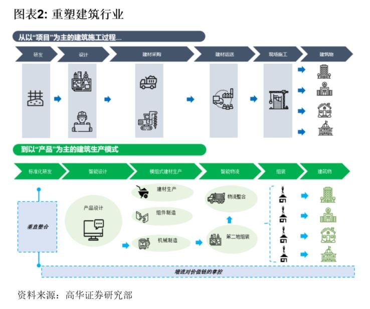 产品和标准化构件、协调物流规划和交付安排以及现场高效安装,将有更多项目将被打造为标准化产品加上一定的个性化设计。总之,我们预计未来建筑将向着更类似于流水线生产的方向转型。